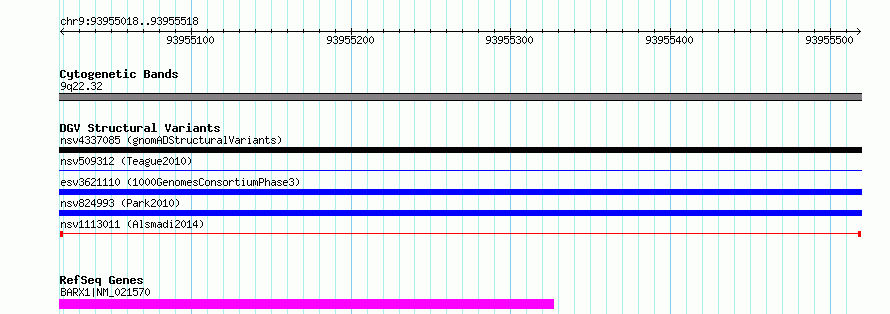 | | Variant Type | CNV deletion | | Copy Number | | | Allele State | | | Allele Origin | | | Probe Count | | | Validation Flag | | | Merged Status | M | | Merged Variants | | | Supporting Variants | nssv3967898 | | Samples | KWS2 | | Known Genes | BARX1 | | Method | Sequencing | | Analysis | HugeSeq | | Platform | Illumina HiSeq 2000 | | Comments | | | Reference | Alsmadi_et_al_2014 | | Pubmed ID | 24896259 | | Accession Number(s) | nsv1113011