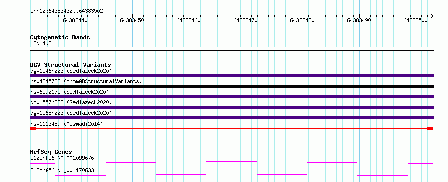 Variant DetailsVariant: nsv1113489| Internal ID | 19255259 | | Landmark | | | Location Information | | | Cytoband | 12q14.2 | | Allele length | | Assembly | Allele length | | hg38 | 71 | | hg19 | 71 |