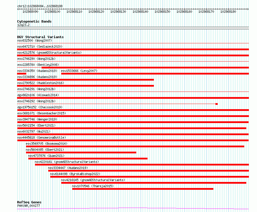 Variant DetailsVariant: nsv1113515| Internal ID | 19265154 | | Landmark | | | Location Information | | | Cytoband | 12q23.2 | | Allele length | | Assembly | Allele length | | hg38 | 105 | | hg19 | 105 |