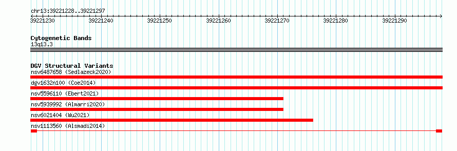 Variant DetailsVariant: nsv1113560| Internal ID | 19267194 | | Landmark | | | Location Information | | | Cytoband | 13q13.3 | | Allele length | | Assembly | Allele length | | hg38 | 70 | | hg19 | 70 |