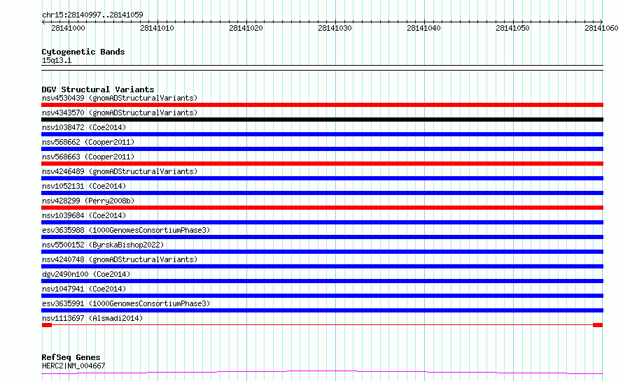 | | Variant Type | CNV deletion | | Copy Number | | | Allele State | | | Allele Origin | | | Probe Count | | | Validation Flag | | | Merged Status | M | | Merged Variants | | | Supporting Variants | nssv3990909, nssv3954742 | | Samples | KWS2, KWS1 | | Known Genes | HERC2 | | Method | Sequencing | | Analysis | HugeSeq | | Platform | Illumina HiSeq 2000 | | Comments | | | Reference | Alsmadi_et_al_2014 | | Pubmed ID | 24896259 | | Accession Number(s) | nsv1113697