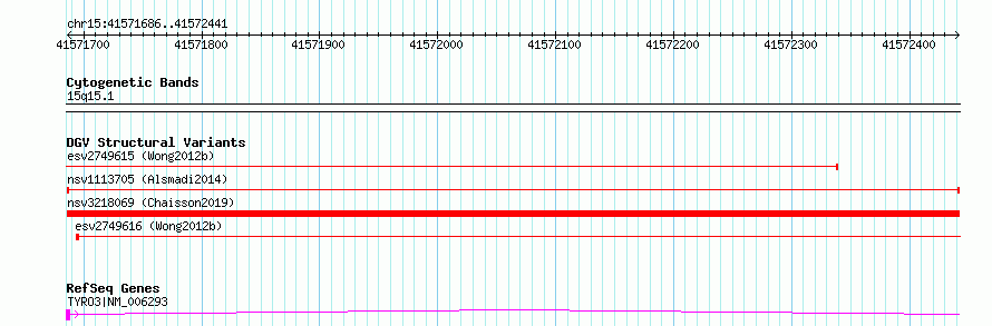 | | Variant Type | CNV deletion | | Copy Number | | | Allele State | | | Allele Origin | | | Probe Count | | | Validation Flag | | | Merged Status | M | | Merged Variants | | | Supporting Variants | nssv3954749, nssv3990921 | | Samples | KWS2, KWS1 | | Known Genes | TYRO3 | | Method | Sequencing | | Analysis | HugeSeq | | Platform | Illumina HiSeq 2000 | | Comments | | | Reference | Alsmadi_et_al_2014 | | Pubmed ID | 24896259 | | Accession Number(s) | nsv1113705