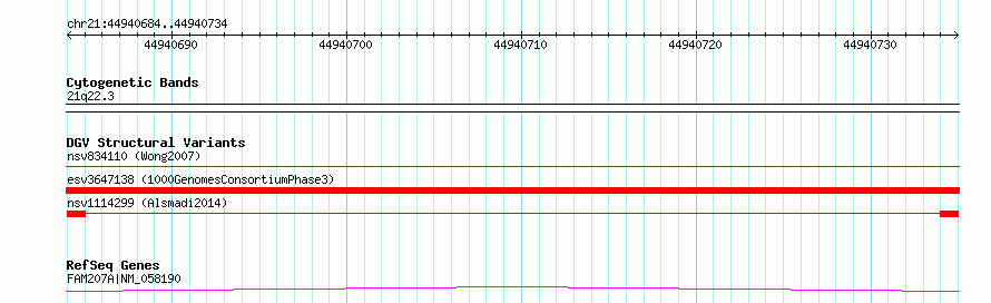 Variant DetailsVariant: nsv1114299| Internal ID | 18939645 | | Landmark | | | Location Information | | | Cytoband | 21q22.3 | | Allele length | | Assembly | Allele length | | hg38 | 51 | | hg19 | 51 |