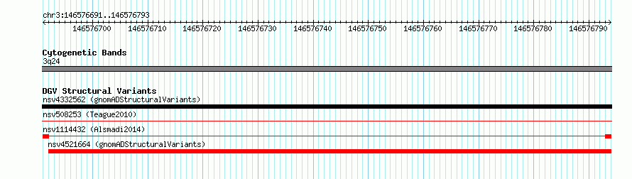 Variant DetailsVariant: nsv1114432Internal ID | 18921462 | Landmark | | Location Information | | Cytoband | 3q24 | Allele length | Assembly | Allele length | hg38 | 103 | hg19 | 103 |