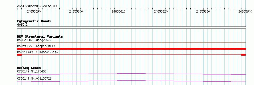 | | Variant Type | CNV deletion | | Copy Number | | | Allele State | | | Allele Origin | | | Probe Count | | | Validation Flag | | | Merged Status | M | | Merged Variants | | | Supporting Variants | nssv3974407 | | Samples | KWS2 | | Known Genes | CCDC149 | | Method | Sequencing | | Analysis | HugeSeq | | Platform | Illumina HiSeq 2000 | | Comments | | | Reference | Alsmadi_et_al_2014 | | Pubmed ID | 24896259 | | Accession Number(s) | nsv1114499