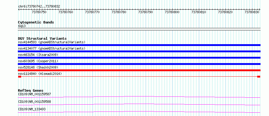 Variant DetailsVariant: nsv1114840| Internal ID | 19255854 | | Landmark | | | Location Information | | | Cytoband | 6q13 | | Allele length | | Assembly | Allele length | | hg38 | 91 | | hg19 | 91 |