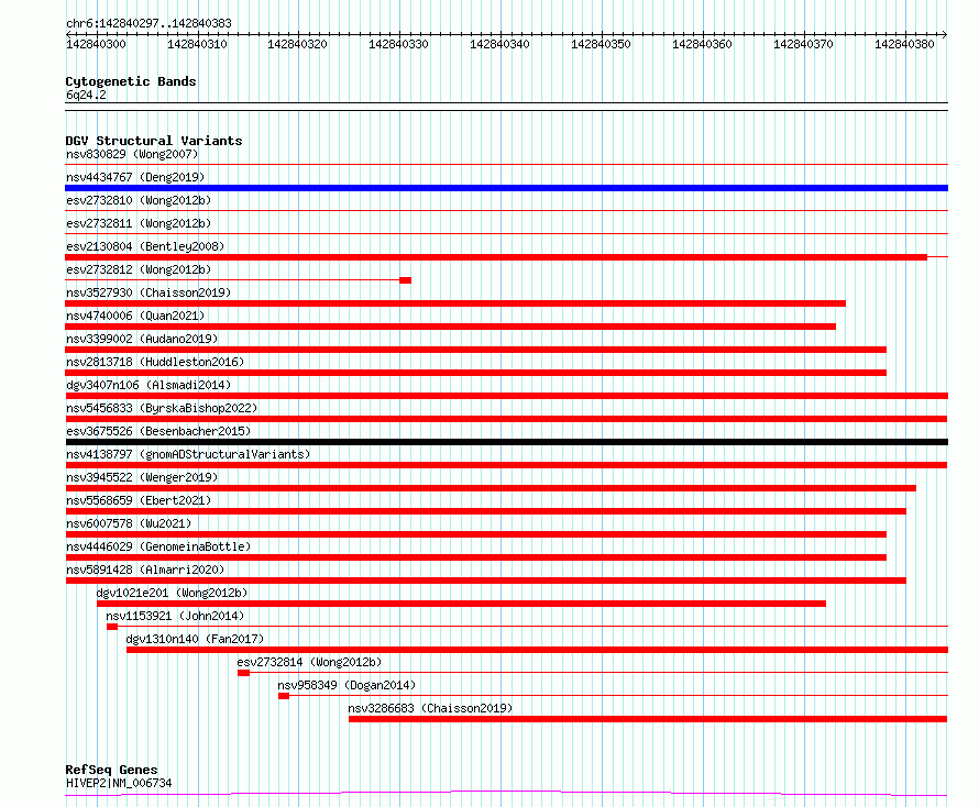Variant DetailsVariant: nsv1114875| Internal ID | 19269470 | | Landmark | | | Location Information | | | Cytoband | 6q24.2 | | Allele length | | Assembly | Allele length | | hg38 | 87 | | hg19 | 87 |