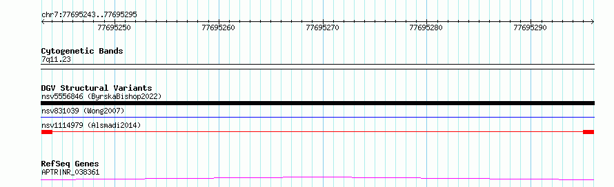 Variant DetailsVariant: nsv1114979| Internal ID | 19268872 | | Landmark | | | Location Information | | | Cytoband | 7q11.23 | | Allele length | | Assembly | Allele length | | hg38 | 53 | | hg19 | 53 |