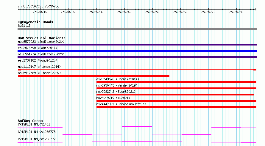 Variant DetailsVariant: nsv1115107| Internal ID | 19276085 | | Landmark | | | Location Information | | | Cytoband | 8q21.11 | | Allele length | | Assembly | Allele length | | hg38 | 85 | | hg19 | 85 |