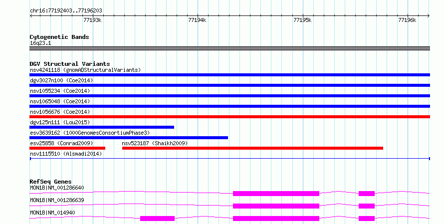 Variant DetailsVariant: nsv1115510| Internal ID | 18913092 | | Landmark | | | Location Information | | | Cytoband | 16q23.1 | | Allele length | | Assembly | Allele length | | hg38 | 3801 | | hg19 | 3801 |