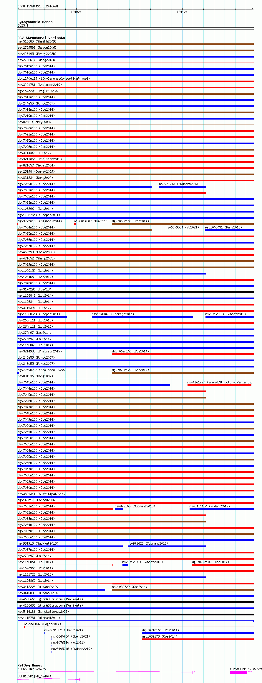 Variant DetailsVariant: nsv1115781| Internal ID | 19265661 | | Landmark | | | Location Information | | | Cytoband | 8p23.1 | | Allele length | | Assembly | Allele length | | hg38 | 22201 | | hg19 | 22201 |