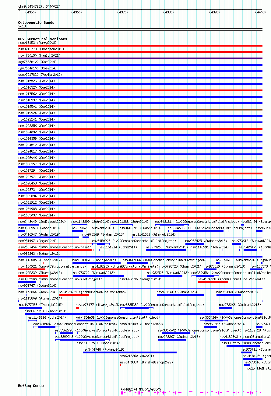 Variant DetailsVariant: nsv1115809| Internal ID | 19268255 | | Landmark | | | Location Information | | | Cytoband | 9p12 | | Allele length | | Assembly | Allele length | | hg38 | 52986 | | hg19 | 53001 |