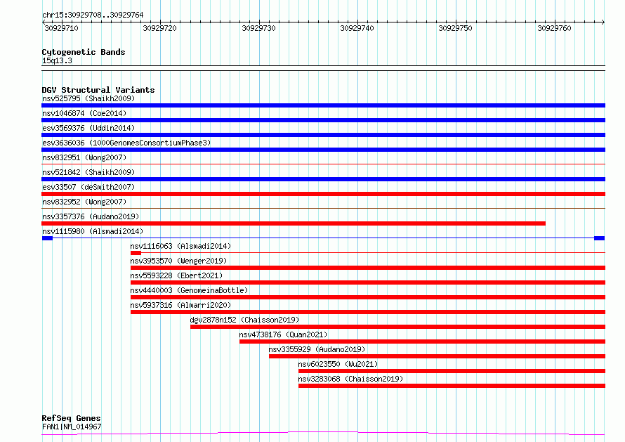 Variant DetailsVariant: nsv1115980| Internal ID | 19251754 | | Landmark | | | Location Information | | | Cytoband | 15q13.3 | | Allele length | | Assembly | Allele length | | hg38 | 57 | | hg19 | 57 |