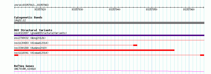 Variant DetailsVariant: nsv1116041| Internal ID | 18921276 | | Landmark | | | Location Information | | | Cytoband | 14q32.12 | | Allele length | | Assembly | Allele length | | hg38 | 51 | | hg19 | 51 |