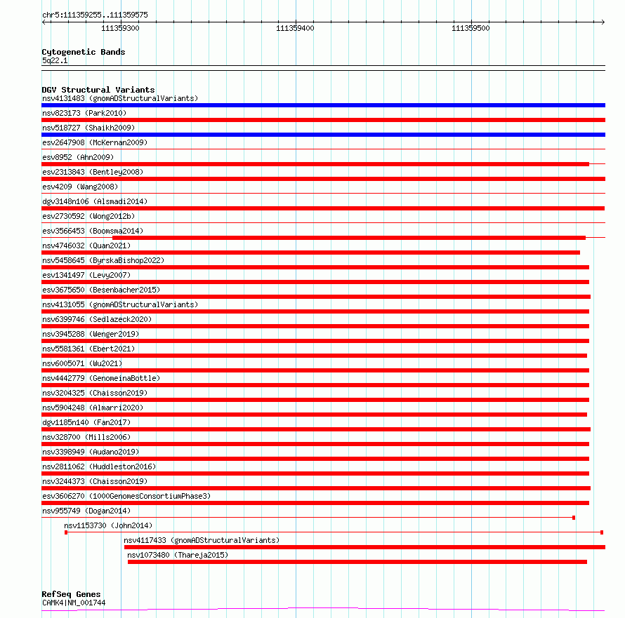 Variant DetailsVariant: nsv1116258| Internal ID | 19284104 | | Landmark | | | Location Information | | | Cytoband | 5q22.1 | | Allele length | | Assembly | Allele length | | hg38 | 321 | | hg19 | 321 |