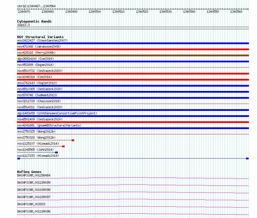 Variant DetailsVariant: nsv1117153| Internal ID | 19272835 | | Landmark | | | Location Information | | | Cytoband | 16p13.3 | | Allele length | | Assembly | Allele length | | hg38 | 98 | | hg19 | 98 |