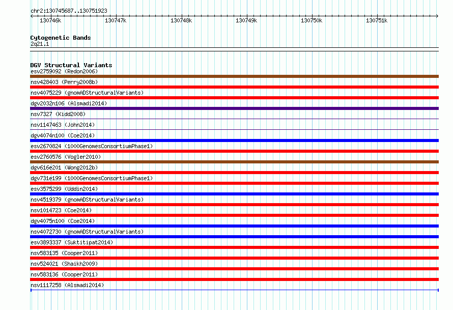 Variant DetailsVariant: nsv1117258| Internal ID | 18922159 | | Landmark | | | Location Information | | | Cytoband | 2q21.1 | | Allele length | | Assembly | Allele length | | hg38 | 6237 | | hg19 | 6237 |