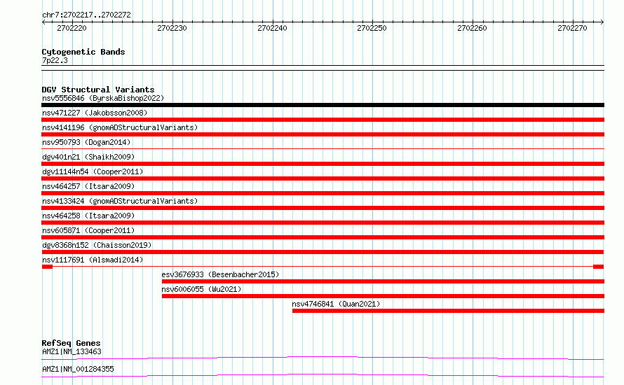 Variant DetailsVariant: nsv1117691| Internal ID | 19262976 | | Landmark | | | Location Information | | | Cytoband | 7p22.3 | | Allele length | | Assembly | Allele length | | hg38 | 56 | | hg19 | 56 |