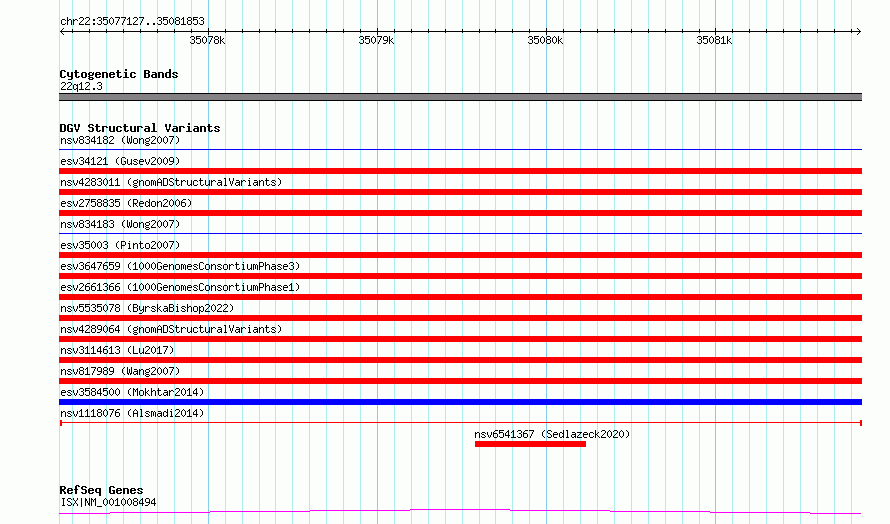 Variant DetailsVariant: nsv1118076| Internal ID | 19268415 | | Landmark | | | Location Information | | | Cytoband | 22q12.3 | | Allele length | | Assembly | Allele length | | hg38 | 4727 | | hg19 | 4727 |