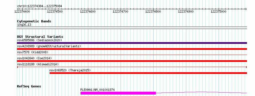 Variant DetailsVariant: nsv1118188| Internal ID | 19267730 | | Landmark | | | Location Information | | | Cytoband | 10q26.13 | | Allele length | | Assembly | Allele length | | hg38 | 701 | | hg19 | 701 |