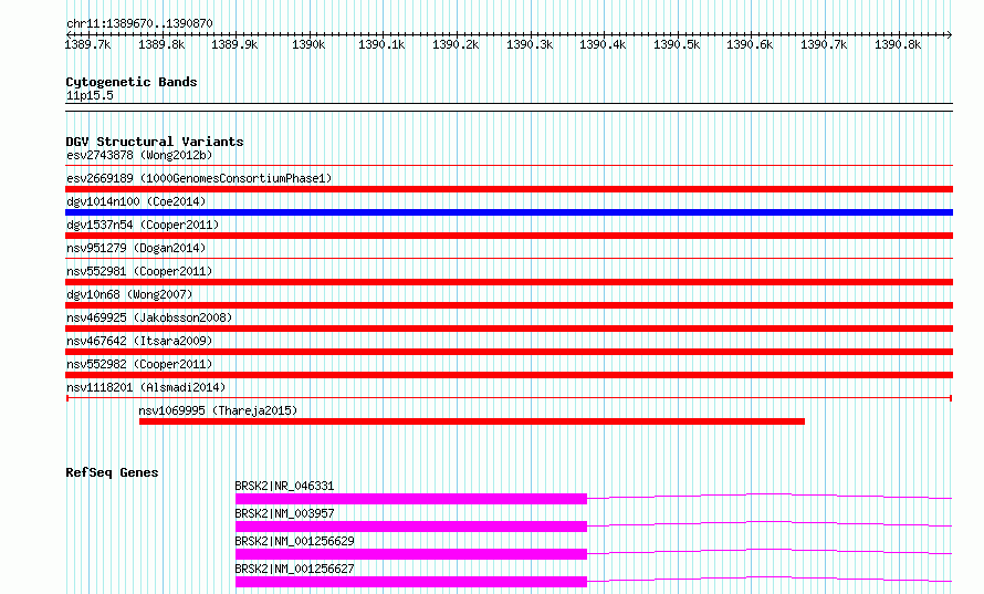 | Variant Type | CNV deletion | Copy Number | | Allele State | | Allele Origin | | Probe Count | | Validation Flag | | Merged Status | M | Merged Variants | | Supporting Variants | nssv3980870 | Samples | KWS1 | Known Genes | BRSK2 | Method | Sequencing | Analysis | HugeSeq | Platform | Illumina HiSeq 2000 | Comments | | Reference | Alsmadi_et_al_2014 | Pubmed ID | 24896259 | Accession Number(s) | nsv1118201