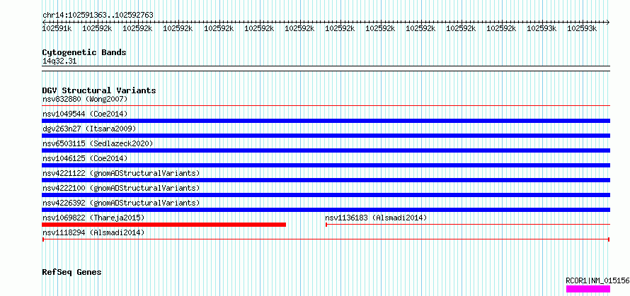 Variant DetailsVariant: nsv1118294| Internal ID | 19277133 | | Landmark | | | Location Information | | | Cytoband | 14q32.31 | | Allele length | | Assembly | Allele length | | hg38 | 1401 | | hg19 | 1401 |