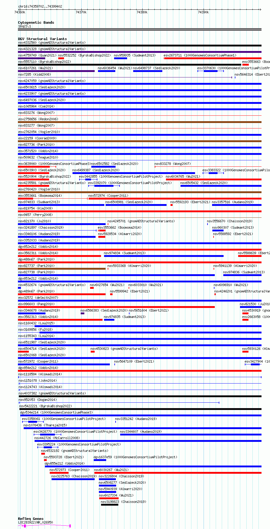Variant DetailsVariant: nsv1118584| Internal ID | 19252380 | | Landmark | | | Location Information | | | Cytoband | 16q23.1 | | Allele length | | Assembly | Allele length | | hg38 | 39701 | | hg19 | 39701 |
