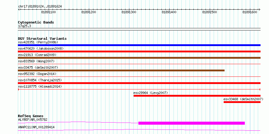 Variant DetailsVariant: nsv1118775| Internal ID | 18921563 | | Landmark | | | Location Information | | | Cytoband | 17q25.3 | | Allele length | | Assembly | Allele length | | hg38 | 601 | | hg19 | 601 |