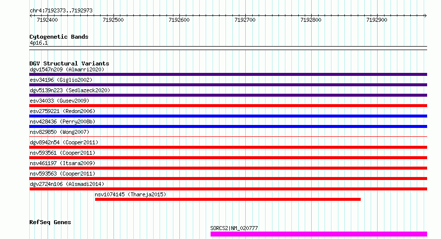 Variant DetailsVariant: nsv1118996| Internal ID | 19279672 | | Landmark | | | Location Information | | | Cytoband | 4p16.1 | | Allele length | | Assembly | Allele length | | hg38 | 601 | | hg19 | 601 |