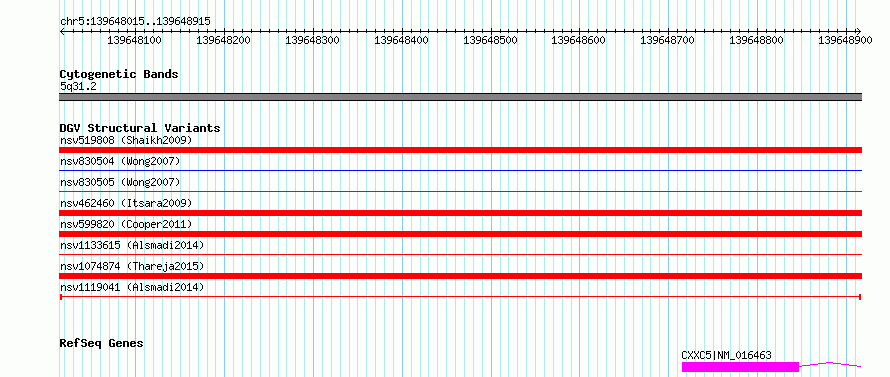 Variant DetailsVariant: nsv1119041| Internal ID | 19276014 | | Landmark | | | Location Information | | | Cytoband | 5q31.2 | | Allele length | | Assembly | Allele length | | hg38 | 901 | | hg19 | 901 |