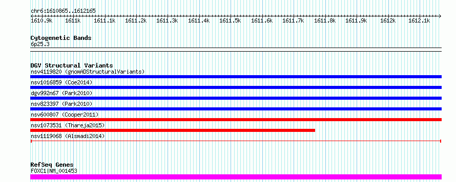 | | Variant Type | CNV deletion | | Copy Number | | | Allele State | | | Allele Origin | | | Probe Count | | | Validation Flag | | | Merged Status | M | | Merged Variants | | | Supporting Variants | nssv3981868 | | Samples | KWS1 | | Known Genes | FOXC1 | | Method | Sequencing | | Analysis | HugeSeq | | Platform | Illumina HiSeq 2000 | | Comments | | | Reference | Alsmadi_et_al_2014 | | Pubmed ID | 24896259 | | Accession Number(s) | nsv1119068