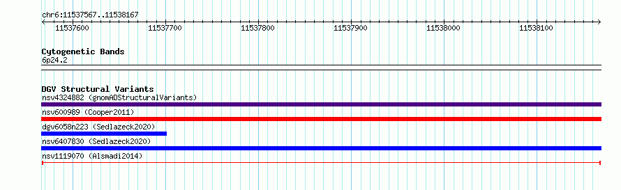 Variant DetailsVariant: nsv1119070| Internal ID | 19259763 | | Landmark | | | Location Information | | | Cytoband | 6p24.2 | | Allele length | | Assembly | Allele length | | hg38 | 601 | | hg19 | 601 |