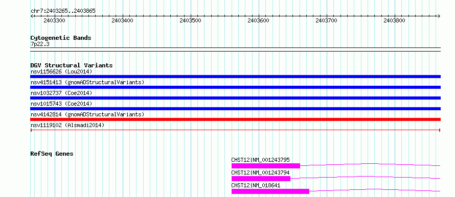 | | Variant Type | CNV deletion | | Copy Number | | | Allele State | | | Allele Origin | | | Probe Count | | | Validation Flag | | | Merged Status | M | | Merged Variants | | | Supporting Variants | nssv3981904 | | Samples | KWS1 | | Known Genes | CHST12 | | Method | Sequencing | | Analysis | HugeSeq | | Platform | Illumina HiSeq 2000 | | Comments | | | Reference | Alsmadi_et_al_2014 | | Pubmed ID | 24896259 | | Accession Number(s) | nsv1119102