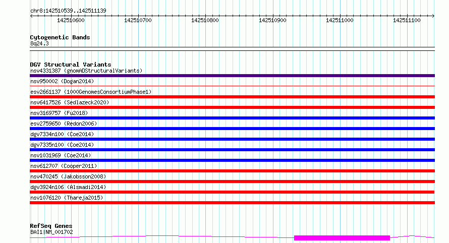Variant DetailsVariant: nsv1119189| Internal ID | 19268706 | | Landmark | | | Location Information | | | Cytoband | 8q24.3 | | Allele length | | Assembly | Allele length | | hg38 | 601 | | hg19 | 601 |