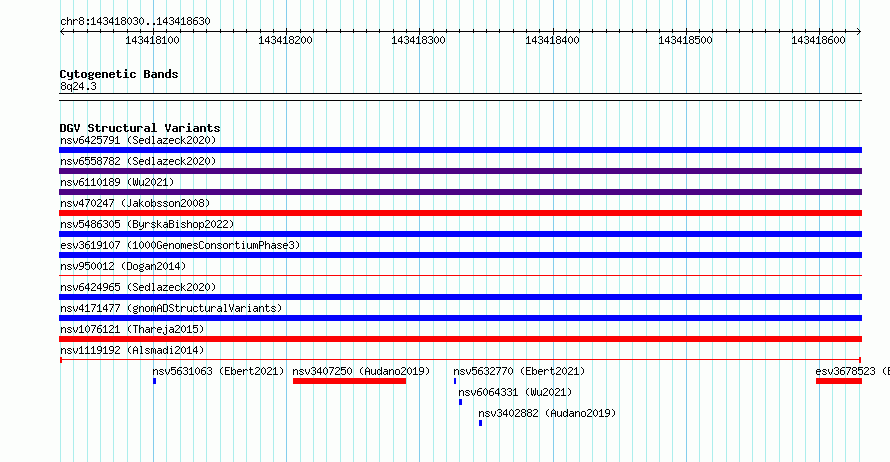 Variant DetailsVariant: nsv1119192| Internal ID | 19283410 | | Landmark | | | Location Information | | | Cytoband | 8q24.3 | | Allele length | | Assembly | Allele length | | hg38 | 601 | | hg19 | 601 |