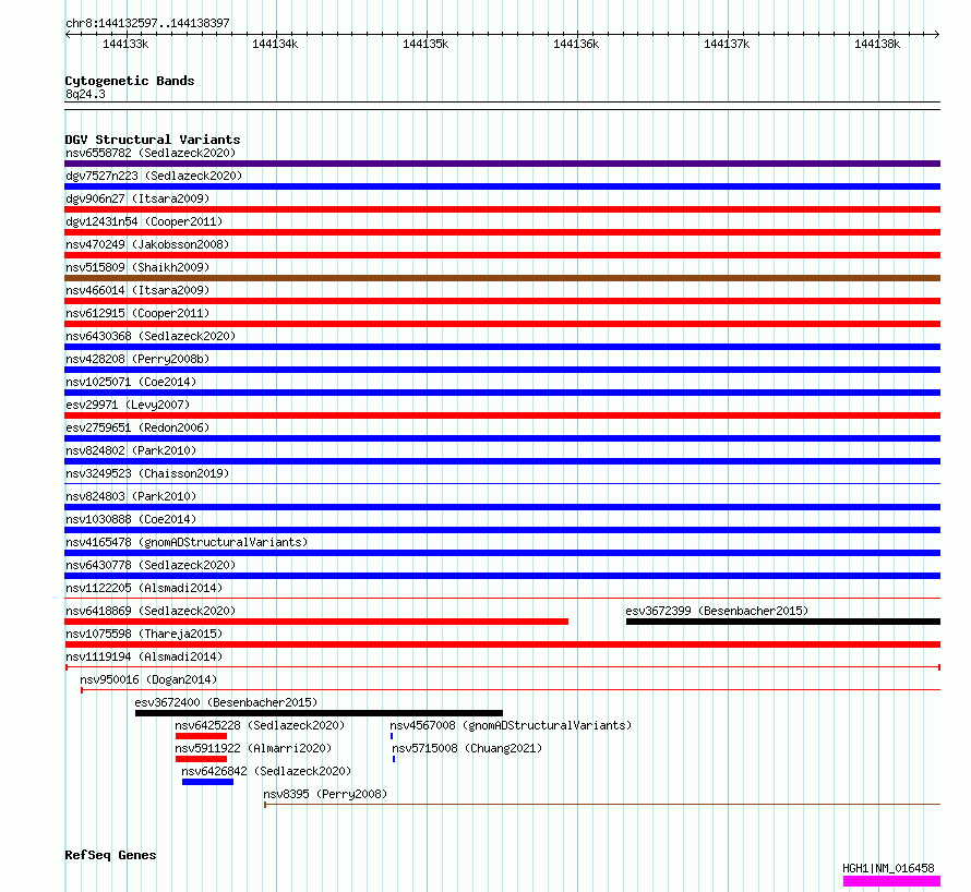 Variant DetailsVariant: nsv1119194| Internal ID | 19257894 | | Landmark | | | Location Information | | | Cytoband | 8q24.3 | | Allele length | | Assembly | Allele length | | hg38 | 5801 | | hg19 | 5801 |