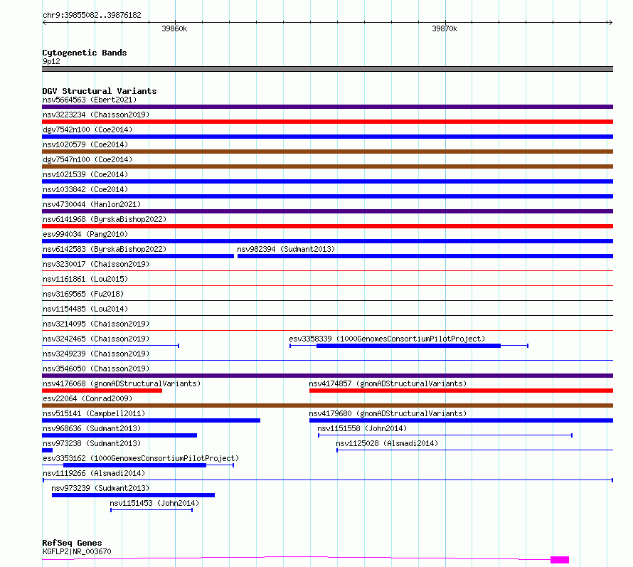 Variant DetailsVariant: nsv1119266| Internal ID | 19253476 | | Landmark | | | Location Information | | | Cytoband | 9p12 | | Allele length | | Assembly | Allele length | | hg38 | 21101 | | hg19 | 21101 |
