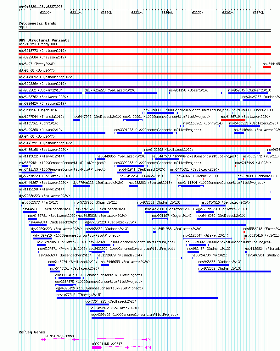 Variant DetailsVariant: nsv1119298| Internal ID | 19271925 | | Landmark | | | Location Information | | | Cytoband | 9q13 | | Allele length | | Assembly | Allele length | | hg38 | 82801 | | hg19 | 82801 |