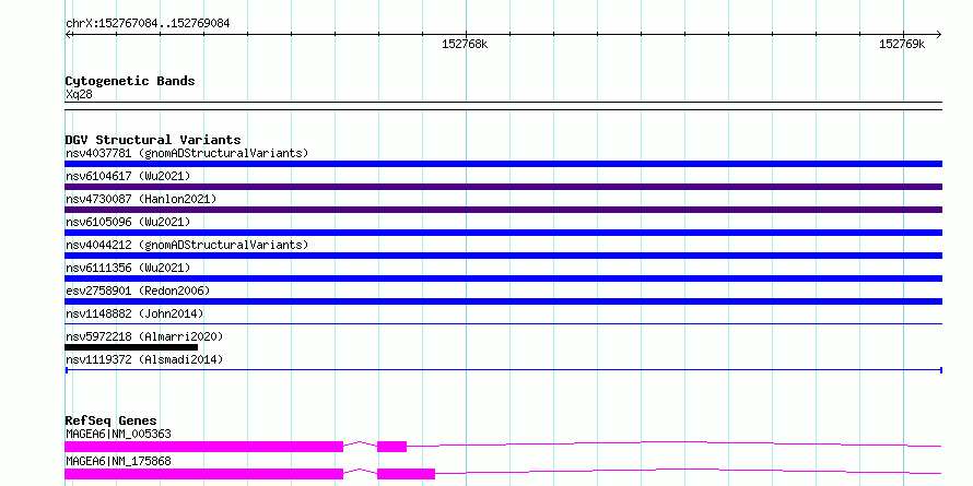 Variant DetailsVariant: nsv1119372| Internal ID | 19263605 | | Landmark | | | Location Information | | | Cytoband | Xq28 | | Allele length | | Assembly | Allele length | | hg38 | 2001 | | hg19 | 2001 |
