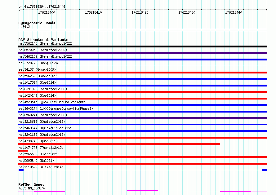 Variant DetailsVariant: nsv1119522| Internal ID | 19250092 | | Landmark | | | Location Information | | | Cytoband | 4q34.2 | | Allele length | | Assembly | Allele length | | hg38 | 53 | | hg19 | 53 |