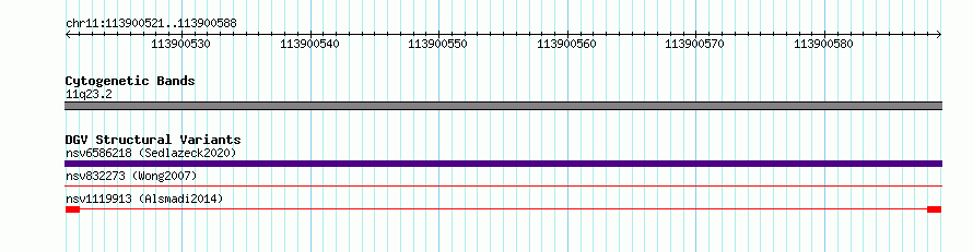 Variant DetailsVariant: nsv1119913| Internal ID | 19285422 | | Landmark | | | Location Information | | | Cytoband | 11q23.2 | | Allele length | | Assembly | Allele length | | hg38 | 68 | | hg19 | 68 |