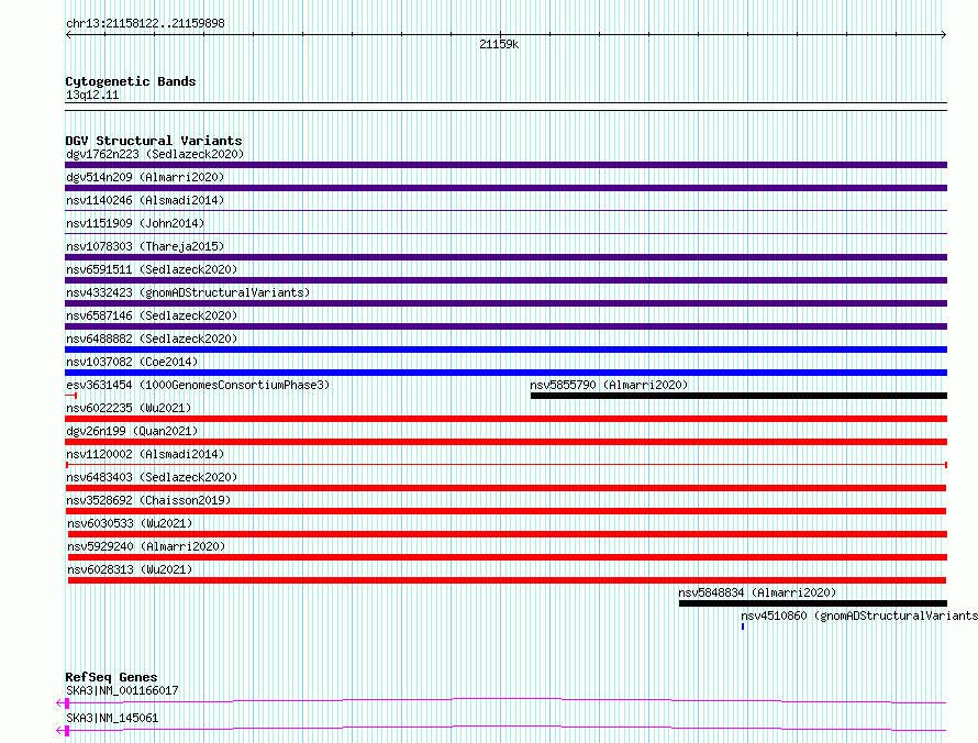 | | Variant Type | CNV deletion | | Copy Number | | | Allele State | | | Allele Origin | | | Probe Count | | | Validation Flag | | | Merged Status | M | | Merged Variants | | | Supporting Variants | nssv3983019 | | Samples | KWS1 | | Known Genes | SKA3 | | Method | Sequencing | | Analysis | HugeSeq | | Platform | Illumina HiSeq 2000 | | Comments | | | Reference | Alsmadi_et_al_2014 | | Pubmed ID | 24896259 | | Accession Number(s) | nsv1120002
