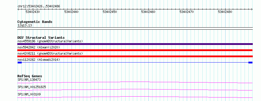 Variant DetailsVariant: nsv1120262| Internal ID | 19258546 | | Landmark | | | Location Information | | | Cytoband | 12q13.13 | | Allele length | | Assembly | Allele length | | hg38 | 61 | | hg19 | 61 |