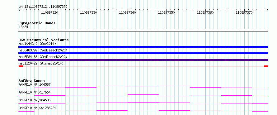 Variant DetailsVariant: nsv1120429| Internal ID | 19275509 | | Landmark | | | Location Information | | | Cytoband | 13q34 | | Allele length | | Assembly | Allele length | | hg38 | 64 | | hg19 | 64 |