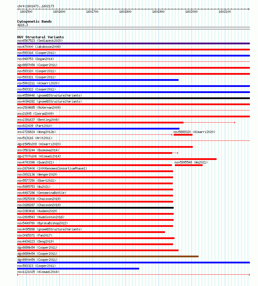 Variant DetailsVariant: nsv1121025| Internal ID | 19267237 | | Landmark | | | Location Information | | | Cytoband | 4p16.3 | | Allele length | | Assembly | Allele length | | hg38 | 701 | | hg19 | 701 |
