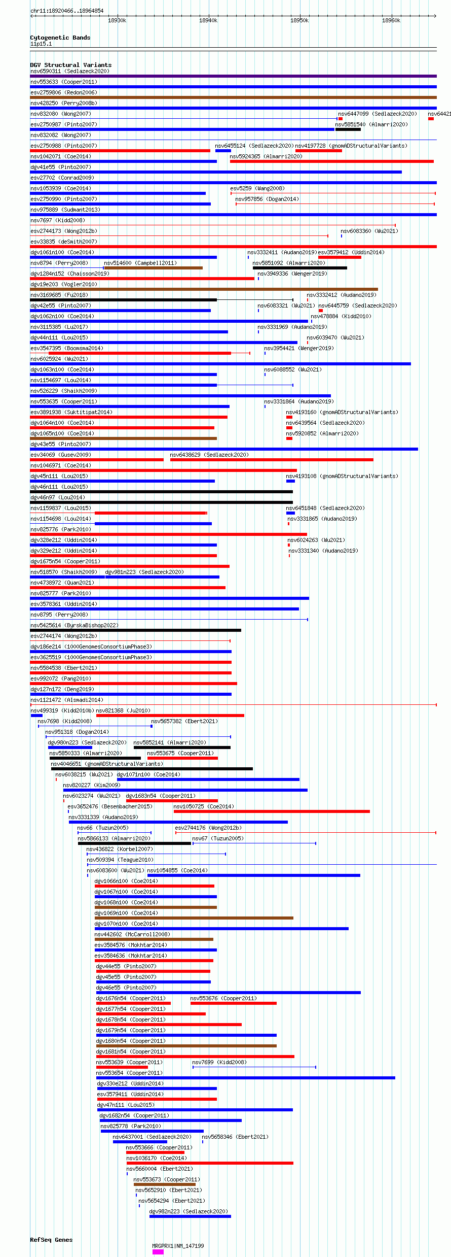 Variant DetailsVariant: nsv1121472| Internal ID | 19272738 | | Landmark | | | Location Information | | | Cytoband | 11p15.1 | | Allele length | | Assembly | Allele length | | hg38 | 44389 | | hg19 | 44389 |