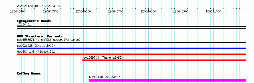 Variant DetailsVariant: nsv1121855| Internal ID | 18931127 | | Landmark | | | Location Information | | | Cytoband | 12q24.31 | | Allele length | | Assembly | Allele length | | hg38 | 701 | | hg19 | 701 |