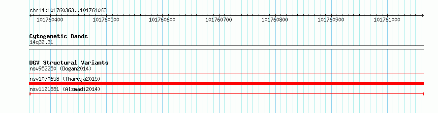 Variant DetailsVariant: nsv1121881| Internal ID | 18938792 | | Landmark | | | Location Information | | | Cytoband | 14q32.31 | | Allele length | | Assembly | Allele length | | hg38 | 701 | | hg19 | 701 |