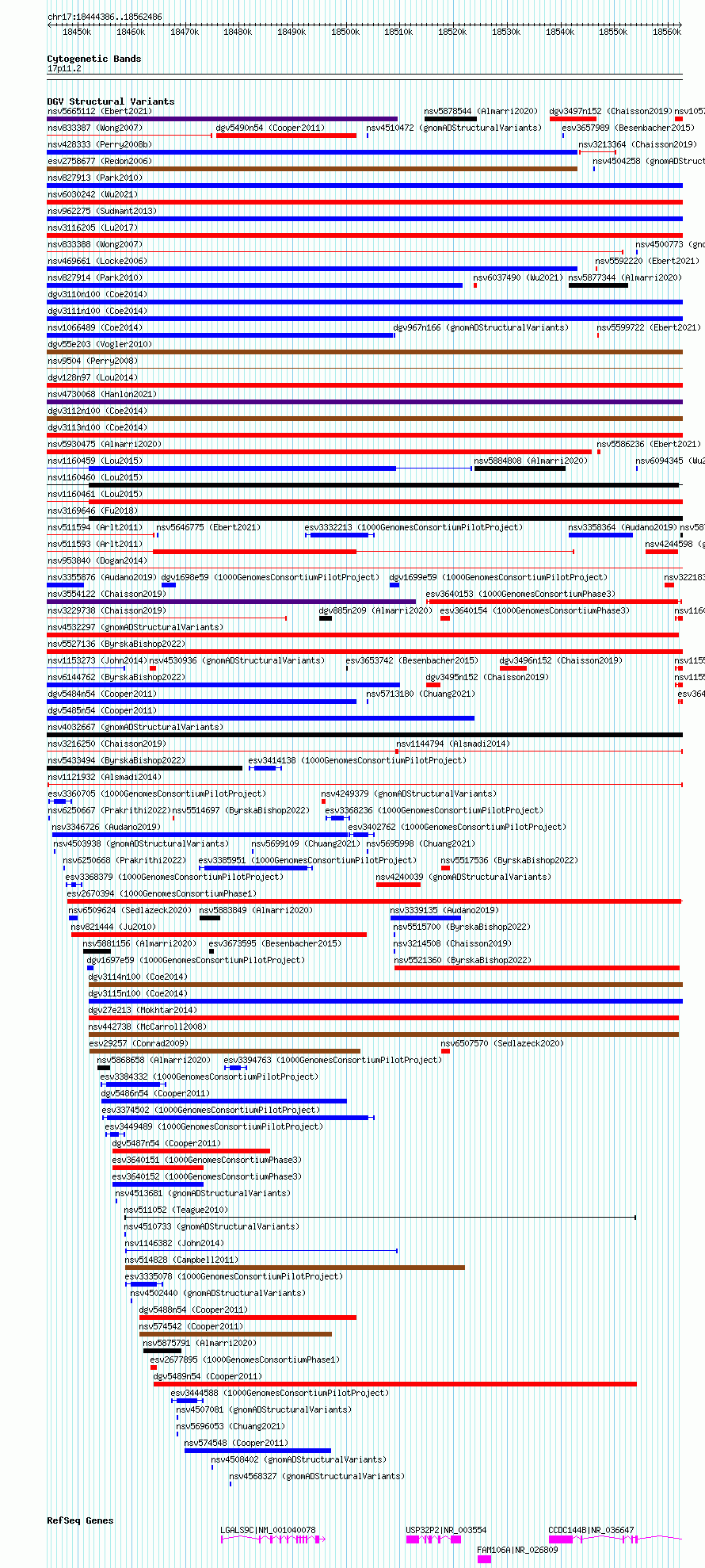 Variant DetailsVariant: nsv1121932| Internal ID | 19267215 | | Landmark | | | Location Information | | | Cytoband | 17p11.2 | | Allele length | | Assembly | Allele length | | hg38 | 118101 | | hg19 | 118101 |