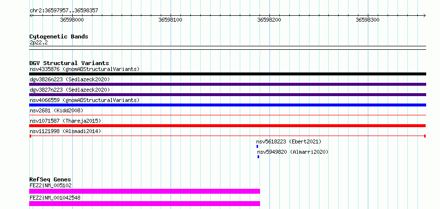 Variant DetailsVariant: nsv1121998| Internal ID | 19265436 | | Landmark | | | Location Information | | | Cytoband | 2p22.2 | | Allele length | | Assembly | Allele length | | hg38 | 401 | | hg19 | 401 |